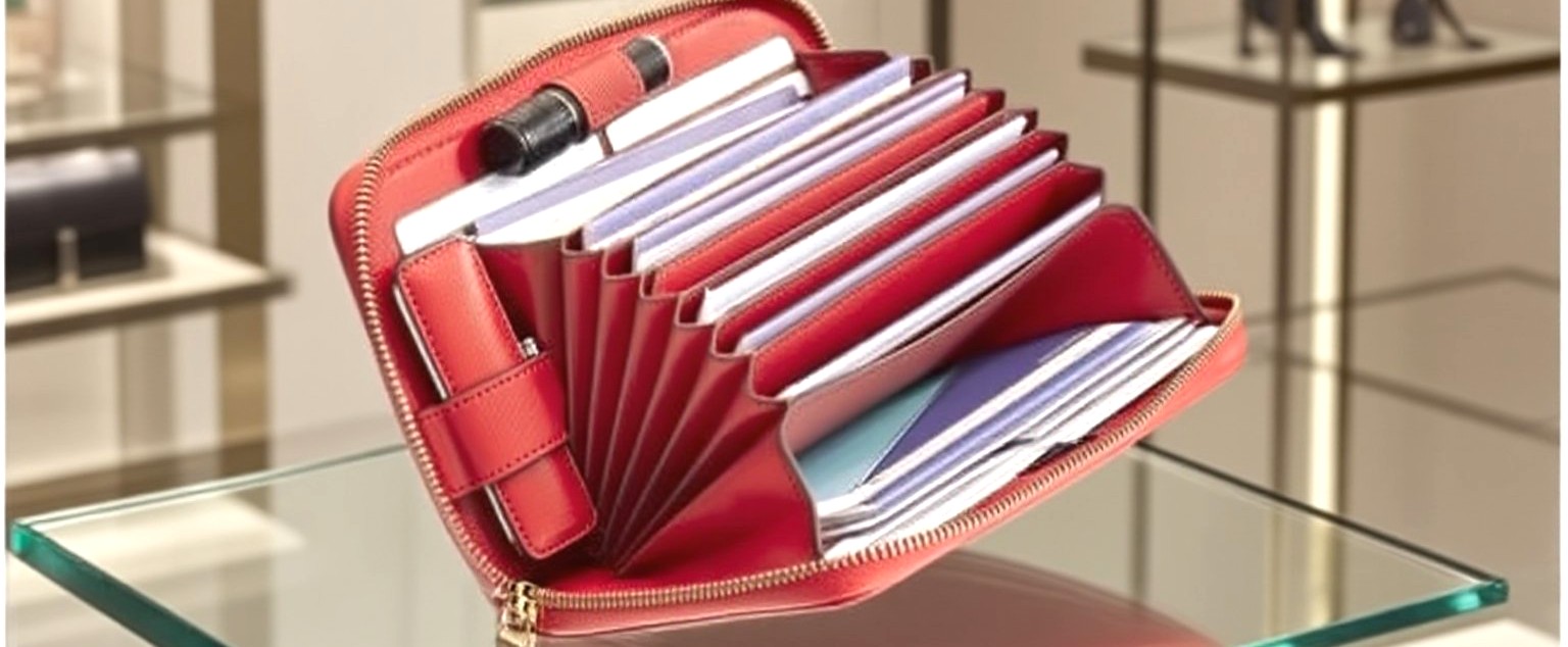 高品質な牛革を使用し、最大8冊の通帳と12枚のカードを収納可能。取り外し可能なクリアマルチケースが付属しており、領収書や小銭の管理にも便利です。